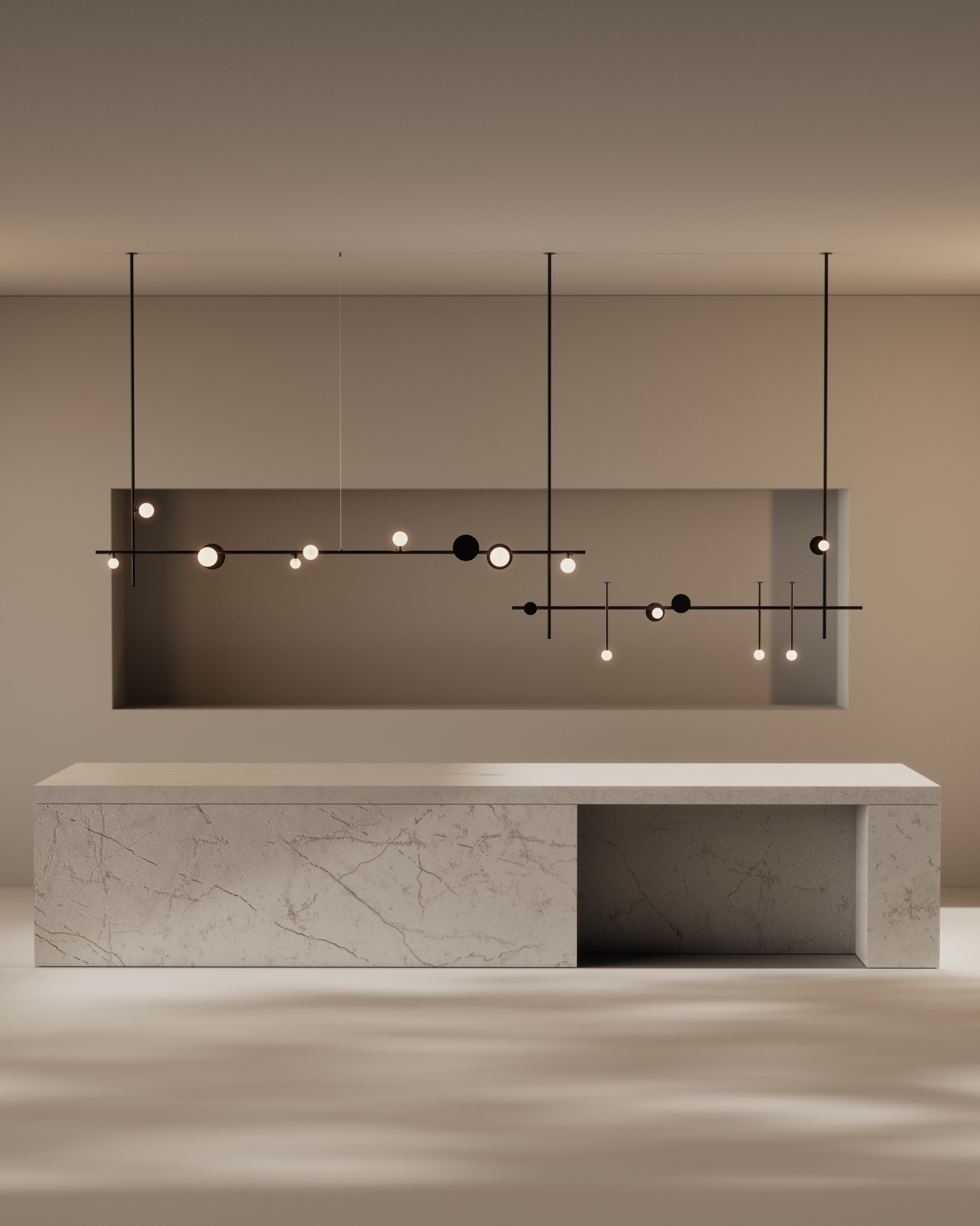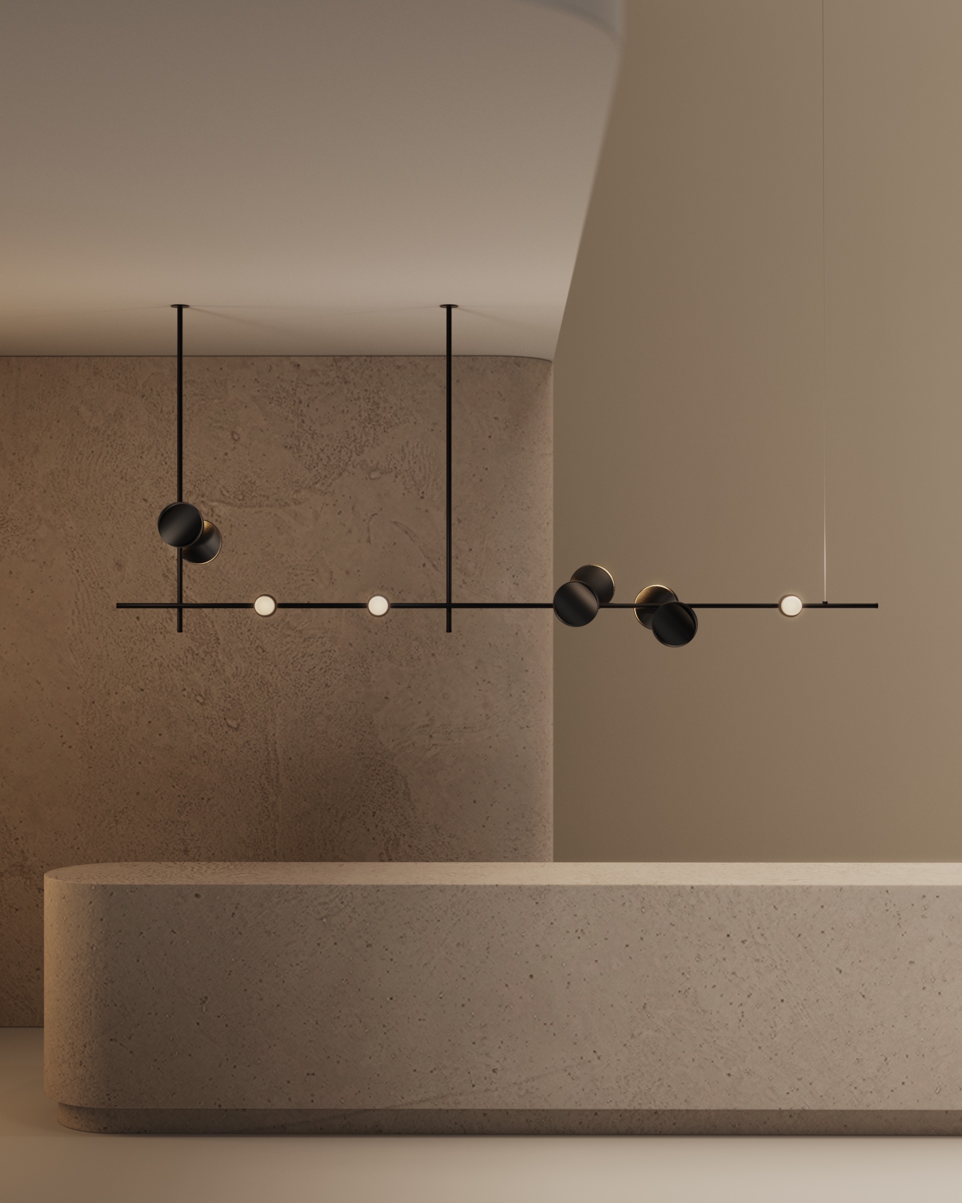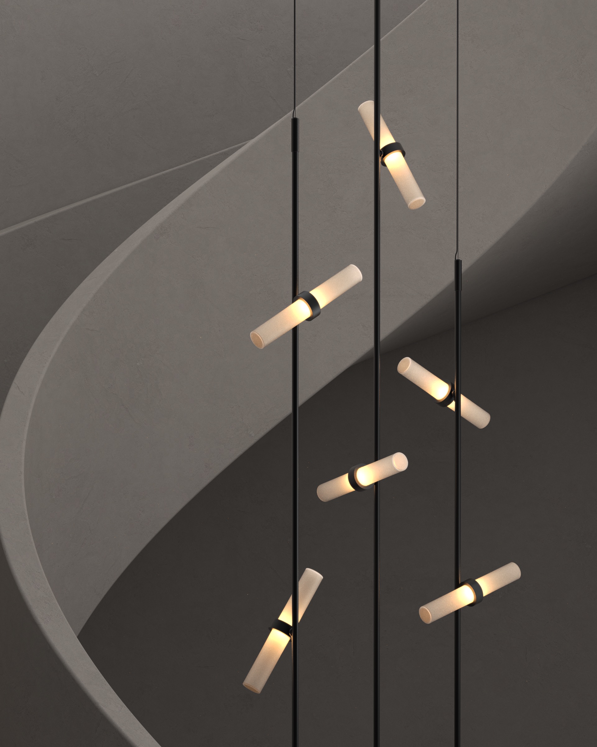 Using Rakumba’s Typography rail system, each light can be positioned anywhere on and around the rail to create a unique sculpture. Lights can be controlled independently of one another for a highly tailored lighting effect. Browse Rakumba’s curated suite of compositions, or create your own.